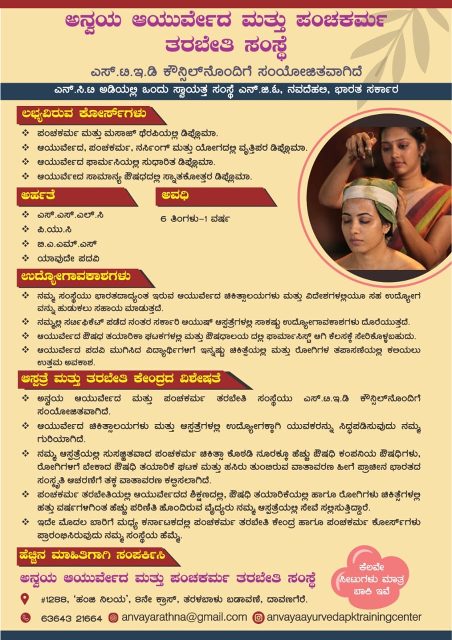 Anvaya Ayurveda is the step stone of Ayurdhama, where it is the first Ayurvedic centre in Davanagere where traditional Ayurvedic medicines like kashaya, gulika, asava-arista etc. made available for all. Ayurdhama was started in 2012 from then many camps for different type of diseases were conducted & many patients were treated successfully with the people from all over the state were flew.